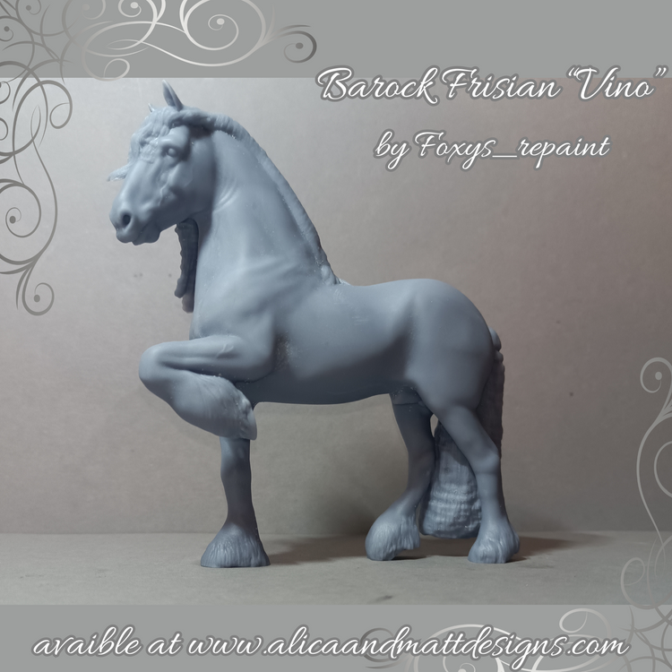 This stately Baroque Friesian stallion named "Vino" is an original 3D model by the wonderful artist Foxys_Repaints, which you can purchase from us as a 3D print. Since we sell this model in collaboration with the artist, who earns a share of the commission from each print, these models are a bit more expensive :).