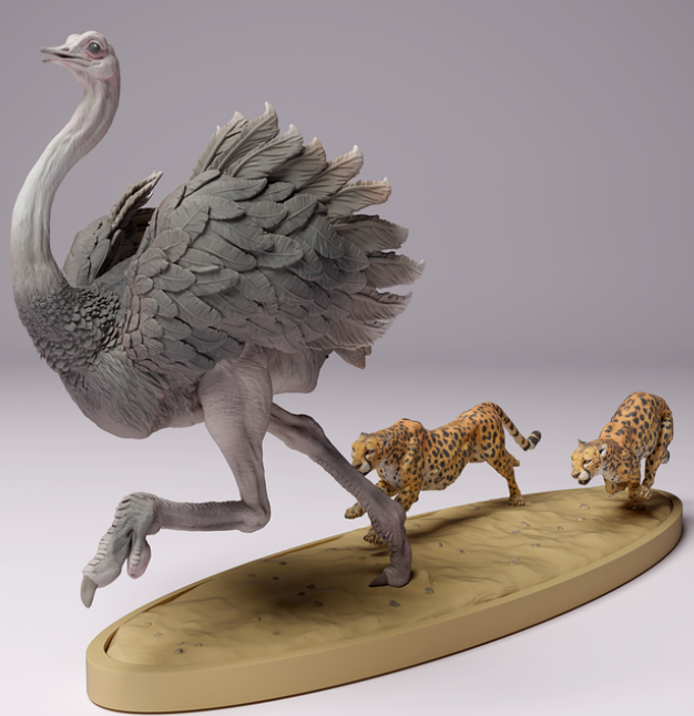 The ostrich being chased by two cheetahs is a 3D model by the wonderful creator Animal Den Miniatures, which you can purchase from us as a 3D print. You will receive the print unpainted, so you can let your creativity run wild.