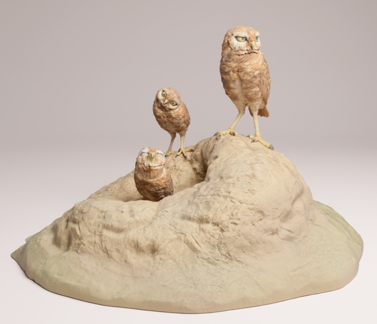 This burrowing owl with its young is a 3D model by the wonderful creator Animal den Miniatures, which you can buy from us as a 3D print.