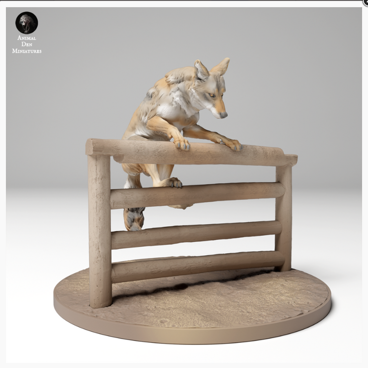 This Coyote who is climbing over a fence is an 3D model from the wonderful creator Animal den Miniatures, which you can purchase from us as a 3D print.