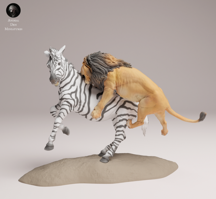 This lion attacking a zebra is a 3D model by the wonderful creator Animal den miniatures, which you can buy from us as a 3D print.