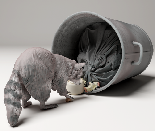 The raccoon rummaging through the trash can is a 3D model by the wonderful creator animal den miniatures, which you can purchase from us as a 3D print. You will receive the print unpainted, so you can let your creativity run wild.