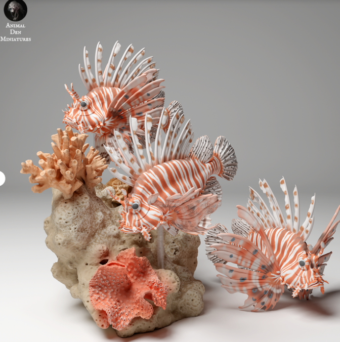 The red lionfish with coral reef is a 3D model by the wonderful creator animal den miniatures, which you can purchase from us as a 3D print. You will receive the print unpainted, so you can let your creativity run wild.